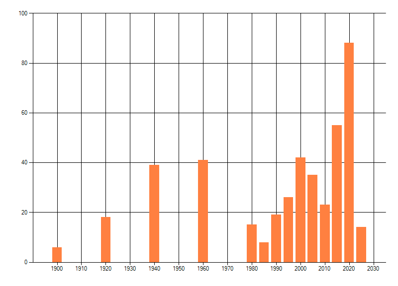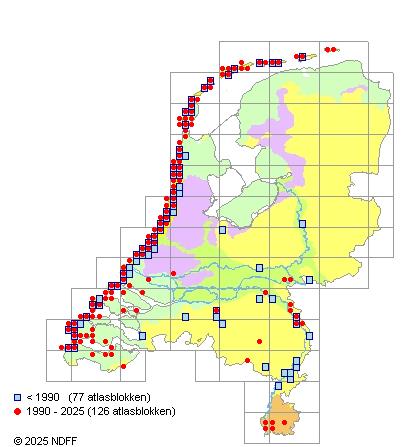 Het aantal atlasblokken (5x5 km) waarin de soort is gemeld binnen een periode van vijf jaar (vanaf 1980) of twintig jaar. Niet gecorrigeerd voor waarnemersinspanning en het aantal doorgegeven waarnemingen kan sterk variëren per periode, dus een trend in verspreiding kan hier niet direct uit worden afgelezen. Het opgegeven jaartal is het eerste jaar van de periode. Bron: gevalideerde waarnemingen uit de NDFF.