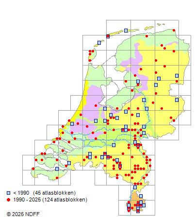 Het aantal atlasblokken (5x5 km) waarin de soort is gemeld binnen een periode van vijf jaar (vanaf 1980) of twintig jaar. Niet gecorrigeerd voor waarnemersinspanning en het aantal doorgegeven waarnemingen kan sterk variëren per periode, dus een trend in verspreiding kan hier niet direct uit worden afgelezen. Het opgegeven jaartal is het eerste jaar van de periode. Bron: gevalideerde waarnemingen uit de NDFF.