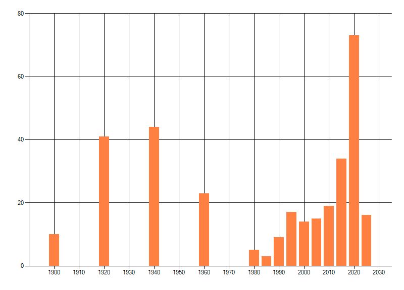 Het aantal atlasblokken (5x5 km) waarin de soort is gemeld binnen een periode van vijf jaar (vanaf 1980) of twintig jaar. Niet gecorrigeerd voor waarnemersinspanning en het aantal doorgegeven waarnemingen kan sterk variëren per periode, dus een trend in verspreiding kan hier niet direct uit worden afgelezen. Het opgegeven jaartal is het eerste jaar van de periode. Bron: gevalideerde waarnemingen uit de NDFF.