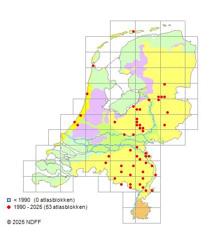 Het aantal atlasblokken (5x5 km) waarin de soort is gemeld binnen een periode van vijf jaar (vanaf 1980) of twintig jaar. Niet gecorrigeerd voor waarnemersinspanning en het aantal doorgegeven waarnemingen kan sterk variëren per periode, dus een trend in verspreiding kan hier niet direct uit worden afgelezen. Het opgegeven jaartal is het eerste jaar van de periode. Bron: gevalideerde waarnemingen uit de NDFF.