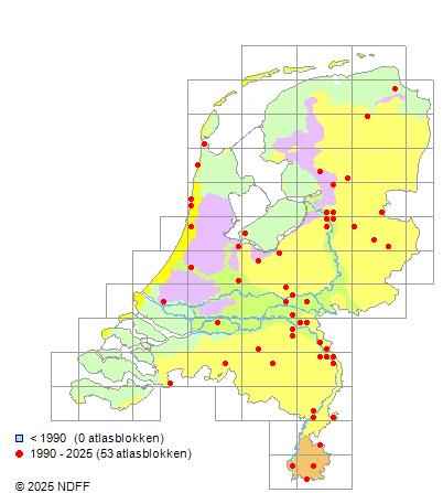 Het aantal atlasblokken (5x5 km) waarin de soort is gemeld binnen een periode van vijf jaar (vanaf 1980) of twintig jaar. Niet gecorrigeerd voor waarnemersinspanning en het aantal doorgegeven waarnemingen kan sterk variëren per periode, dus een trend in verspreiding kan hier niet direct uit worden afgelezen. Het opgegeven jaartal is het eerste jaar van de periode. Bron: gevalideerde waarnemingen uit de NDFF.