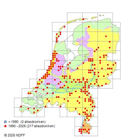 Het aantal atlasblokken (5x5 km) waarin de soort is gemeld binnen een periode van vijf jaar (vanaf 1980) of twintig jaar. Niet gecorrigeerd voor waarnemersinspanning en het aantal doorgegeven waarnemingen kan sterk variëren per periode, dus een trend in verspreiding kan hier niet direct uit worden afgelezen. Het opgegeven jaartal is het eerste jaar van de periode. Bron: gevalideerde waarnemingen uit de NDFF.