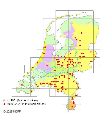 Het aantal atlasblokken (5x5 km) waarin de soort is gemeld binnen een periode van vijf jaar (vanaf 1980) of twintig jaar. Niet gecorrigeerd voor waarnemersinspanning en het aantal doorgegeven waarnemingen kan sterk variëren per periode, dus een trend in verspreiding kan hier niet direct uit worden afgelezen. Het opgegeven jaartal is het eerste jaar van de periode. Bron: gevalideerde waarnemingen uit de NDFF.