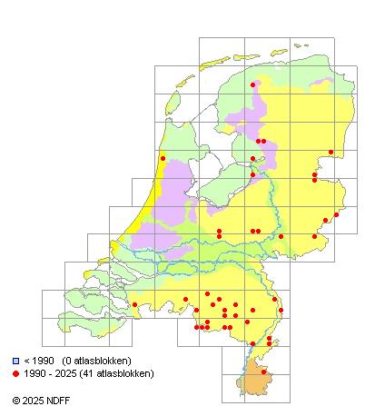 Het aantal atlasblokken (5x5 km) waarin de soort is gemeld binnen een periode van vijf jaar (vanaf 1980) of twintig jaar. Niet gecorrigeerd voor waarnemersinspanning en het aantal doorgegeven waarnemingen kan sterk variëren per periode, dus een trend in verspreiding kan hier niet direct uit worden afgelezen. Het opgegeven jaartal is het eerste jaar van de periode. Bron: gevalideerde waarnemingen uit de NDFF.