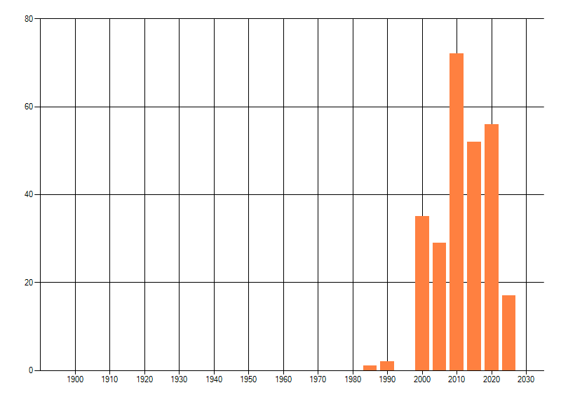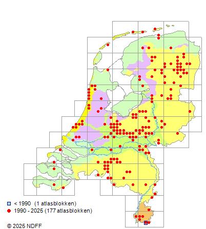 Het aantal atlasblokken (5x5 km) waarin de soort is gemeld binnen een periode van vijf jaar (vanaf 1980) of twintig jaar. Niet gecorrigeerd voor waarnemersinspanning en het aantal doorgegeven waarnemingen kan sterk variëren per periode, dus een trend in verspreiding kan hier niet direct uit worden afgelezen. Het opgegeven jaartal is het eerste jaar van de periode. Bron: gevalideerde waarnemingen uit de NDFF.