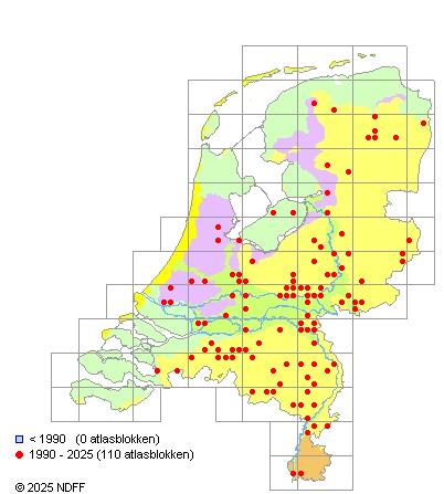 Het aantal atlasblokken (5x5 km) waarin de soort is gemeld binnen een periode van vijf jaar (vanaf 1980) of twintig jaar. Niet gecorrigeerd voor waarnemersinspanning en het aantal doorgegeven waarnemingen kan sterk variëren per periode, dus een trend in verspreiding kan hier niet direct uit worden afgelezen. Het opgegeven jaartal is het eerste jaar van de periode. Bron: gevalideerde waarnemingen uit de NDFF.