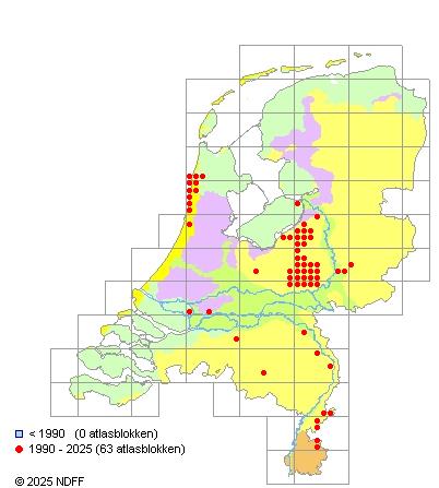 Het aantal atlasblokken (5x5 km) waarin de soort is gemeld binnen een periode van vijf jaar (vanaf 1980) of twintig jaar. Niet gecorrigeerd voor waarnemersinspanning en het aantal doorgegeven waarnemingen kan sterk variëren per periode, dus een trend in verspreiding kan hier niet direct uit worden afgelezen. Het opgegeven jaartal is het eerste jaar van de periode. Bron: gevalideerde waarnemingen uit de NDFF.