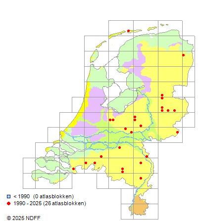 Het aantal atlasblokken (5x5 km) waarin de soort is gemeld binnen een periode van vijf jaar (vanaf 1980) of twintig jaar. Niet gecorrigeerd voor waarnemersinspanning en het aantal doorgegeven waarnemingen kan sterk variëren per periode, dus een trend in verspreiding kan hier niet direct uit worden afgelezen. Het opgegeven jaartal is het eerste jaar van de periode. Bron: gevalideerde waarnemingen uit de NDFF.