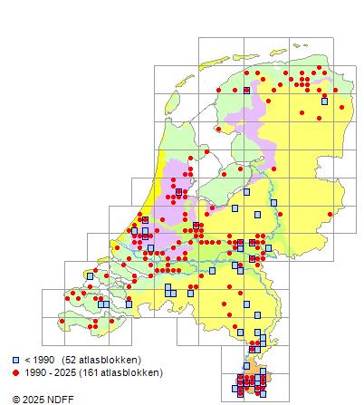 Het aantal atlasblokken (5x5 km) waarin de soort is gemeld binnen een periode van vijf jaar (vanaf 1980) of twintig jaar. Niet gecorrigeerd voor waarnemersinspanning en het aantal doorgegeven waarnemingen kan sterk variëren per periode, dus een trend in verspreiding kan hier niet direct uit worden afgelezen. Het opgegeven jaartal is het eerste jaar van de periode. Bron: gevalideerde waarnemingen uit de NDFF.