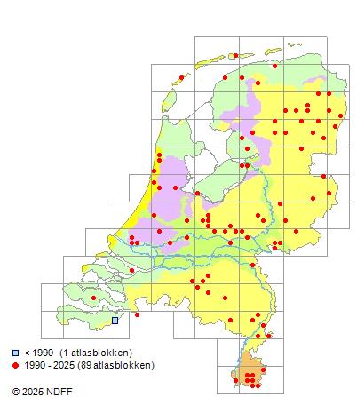 Het aantal atlasblokken (5x5 km) waarin de soort is gemeld binnen een periode van vijf jaar (vanaf 1980) of twintig jaar. Niet gecorrigeerd voor waarnemersinspanning en het aantal doorgegeven waarnemingen kan sterk variëren per periode, dus een trend in verspreiding kan hier niet direct uit worden afgelezen. Het opgegeven jaartal is het eerste jaar van de periode. Bron: gevalideerde waarnemingen uit de NDFF.