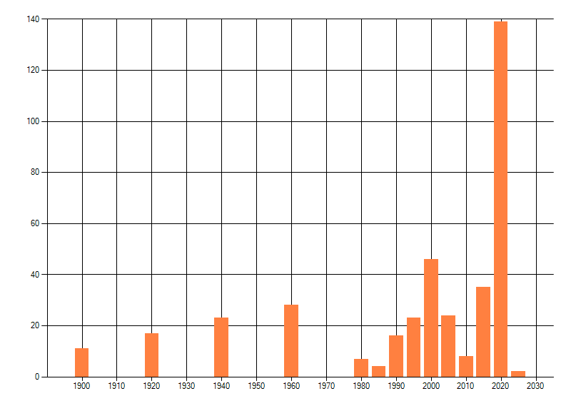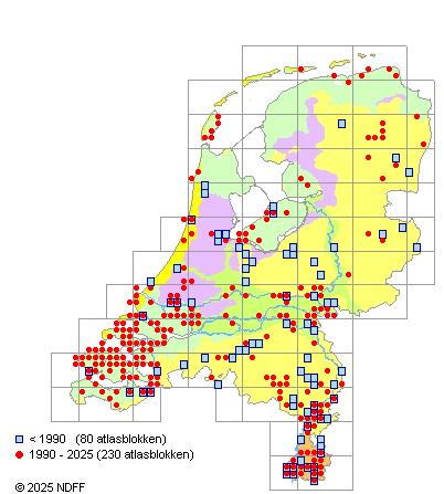Het aantal atlasblokken (5x5 km) waarin de soort is gemeld binnen een periode van vijf jaar (vanaf 1980) of twintig jaar. Niet gecorrigeerd voor waarnemersinspanning en het aantal doorgegeven waarnemingen kan sterk variëren per periode, dus een trend in verspreiding kan hier niet direct uit worden afgelezen. Het opgegeven jaartal is het eerste jaar van de periode. Bron: gevalideerde waarnemingen uit de NDFF.