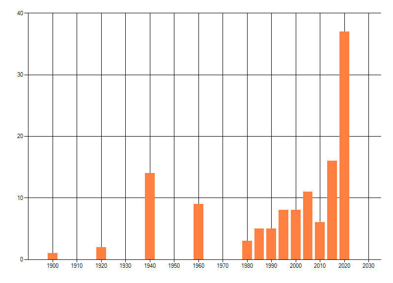Het aantal atlasblokken (5x5 km) waarin de soort is gemeld binnen een periode van vijf jaar (vanaf 1980) of twintig jaar. Niet gecorrigeerd voor waarnemersinspanning en het aantal doorgegeven waarnemingen kan sterk variëren per periode, dus een trend in verspreiding kan hier niet direct uit worden afgelezen. Het opgegeven jaartal is het eerste jaar van de periode. Bron: gevalideerde waarnemingen uit de NDFF.