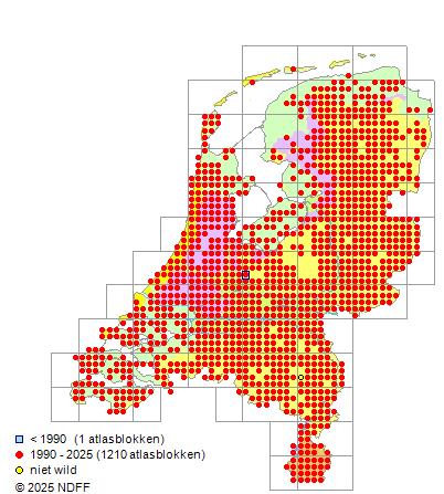 Het aantal atlasblokken (5x5 km) waarin de soort is gemeld binnen een periode van vijf jaar (vanaf 1980) of twintig jaar. Niet gecorrigeerd voor waarnemersinspanning en het aantal doorgegeven waarnemingen kan sterk variëren per periode, dus een trend in verspreiding kan hier niet direct uit worden afgelezen. Het opgegeven jaartal is het eerste jaar van de periode. Bron: gevalideerde waarnemingen uit de NDFF.