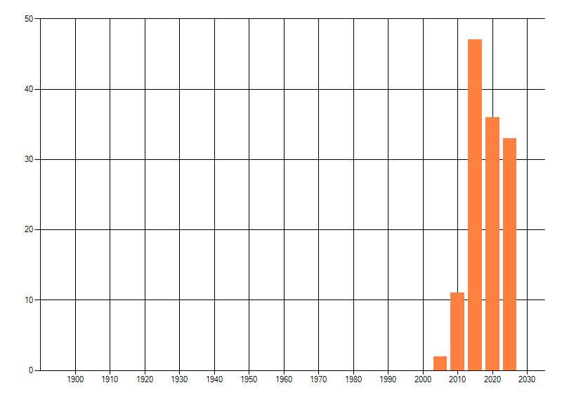 Het aantal atlasblokken (5x5 km) waarin de soort is gemeld binnen een periode van vijf jaar (vanaf 1980) of twintig jaar. Niet gecorrigeerd voor waarnemersinspanning en het aantal doorgegeven waarnemingen kan sterk variëren per periode, dus een trend in verspreiding kan hier niet direct uit worden afgelezen. Het opgegeven jaartal is het eerste jaar van de periode. Bron: gevalideerde waarnemingen uit de NDFF.