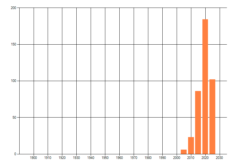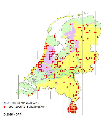 Het aantal atlasblokken (5x5 km) waarin de soort is gemeld binnen een periode van vijf jaar (vanaf 1980) of twintig jaar. Niet gecorrigeerd voor waarnemersinspanning en het aantal doorgegeven waarnemingen kan sterk variëren per periode, dus een trend in verspreiding kan hier niet direct uit worden afgelezen. Het opgegeven jaartal is het eerste jaar van de periode. Bron: gevalideerde waarnemingen uit de NDFF.