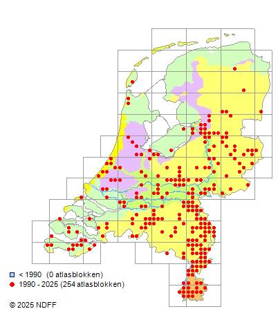 Het aantal atlasblokken (5x5 km) waarin de soort is gemeld binnen een periode van vijf jaar (vanaf 1980) of twintig jaar. Niet gecorrigeerd voor waarnemersinspanning en het aantal doorgegeven waarnemingen kan sterk variëren per periode, dus een trend in verspreiding kan hier niet direct uit worden afgelezen. Het opgegeven jaartal is het eerste jaar van de periode. Bron: gevalideerde waarnemingen uit de NDFF.