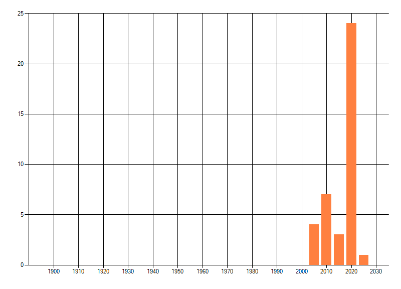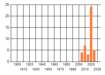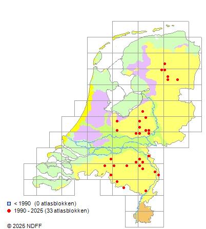Het aantal atlasblokken (5x5 km) waarin de soort is gemeld binnen een periode van vijf jaar (vanaf 1980) of twintig jaar. Niet gecorrigeerd voor waarnemersinspanning en het aantal doorgegeven waarnemingen kan sterk variëren per periode, dus een trend in verspreiding kan hier niet direct uit worden afgelezen. Het opgegeven jaartal is het eerste jaar van de periode. Bron: gevalideerde waarnemingen uit de NDFF.
