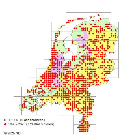 Het aantal atlasblokken (5x5 km) waarin de soort is gemeld binnen een periode van vijf jaar (vanaf 1980) of twintig jaar. Niet gecorrigeerd voor waarnemersinspanning en het aantal doorgegeven waarnemingen kan sterk variëren per periode, dus een trend in verspreiding kan hier niet direct uit worden afgelezen. Het opgegeven jaartal is het eerste jaar van de periode. Bron: gevalideerde waarnemingen uit de NDFF.