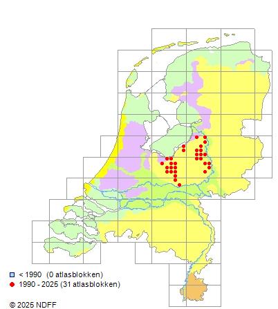 Het aantal atlasblokken (5x5 km) waarin de soort is gemeld binnen een periode van vijf jaar (vanaf 1980) of twintig jaar. Niet gecorrigeerd voor waarnemersinspanning en het aantal doorgegeven waarnemingen kan sterk variëren per periode, dus een trend in verspreiding kan hier niet direct uit worden afgelezen. Het opgegeven jaartal is het eerste jaar van de periode. Bron: gevalideerde waarnemingen uit de NDFF.