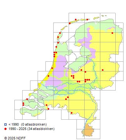 Het aantal atlasblokken (5x5 km) waarin de soort is gemeld binnen een periode van vijf jaar (vanaf 1980) of twintig jaar. Niet gecorrigeerd voor waarnemersinspanning en het aantal doorgegeven waarnemingen kan sterk variëren per periode, dus een trend in verspreiding kan hier niet direct uit worden afgelezen. Het opgegeven jaartal is het eerste jaar van de periode. Bron: gevalideerde waarnemingen uit de NDFF.