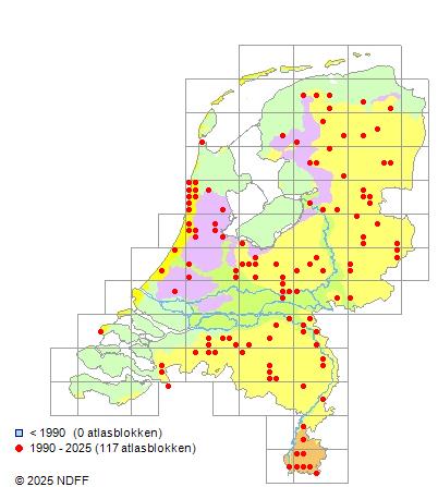 Het aantal atlasblokken (5x5 km) waarin de soort is gemeld binnen een periode van vijf jaar (vanaf 1980) of twintig jaar. Niet gecorrigeerd voor waarnemersinspanning en het aantal doorgegeven waarnemingen kan sterk variëren per periode, dus een trend in verspreiding kan hier niet direct uit worden afgelezen. Het opgegeven jaartal is het eerste jaar van de periode. Bron: gevalideerde waarnemingen uit de NDFF.