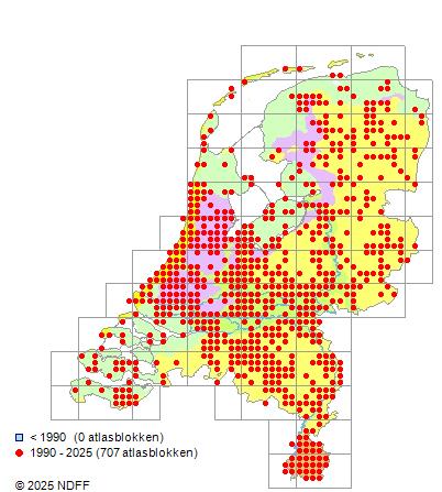 Het aantal atlasblokken (5x5 km) waarin de soort is gemeld binnen een periode van vijf jaar (vanaf 1980) of twintig jaar. Niet gecorrigeerd voor waarnemersinspanning en het aantal doorgegeven waarnemingen kan sterk variëren per periode, dus een trend in verspreiding kan hier niet direct uit worden afgelezen. Het opgegeven jaartal is het eerste jaar van de periode. Bron: gevalideerde waarnemingen uit de NDFF.