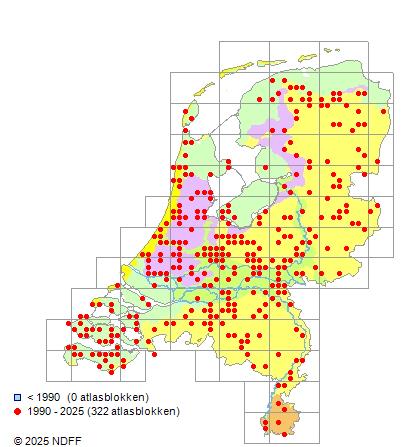 Het aantal atlasblokken (5x5 km) waarin de soort is gemeld binnen een periode van vijf jaar (vanaf 1980) of twintig jaar. Niet gecorrigeerd voor waarnemersinspanning en het aantal doorgegeven waarnemingen kan sterk variëren per periode, dus een trend in verspreiding kan hier niet direct uit worden afgelezen. Het opgegeven jaartal is het eerste jaar van de periode. Bron: gevalideerde waarnemingen uit de NDFF.