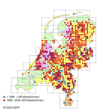 Het aantal atlasblokken (5x5 km) waarin de soort is gemeld binnen een periode van vijf jaar (vanaf 1980) of twintig jaar. Niet gecorrigeerd voor waarnemersinspanning en het aantal doorgegeven waarnemingen kan sterk variëren per periode, dus een trend in verspreiding kan hier niet direct uit worden afgelezen. Het opgegeven jaartal is het eerste jaar van de periode. Bron: gevalideerde waarnemingen uit de NDFF.