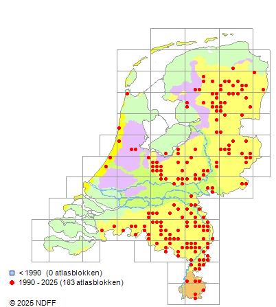 Het aantal atlasblokken (5x5 km) waarin de soort is gemeld binnen een periode van vijf jaar (vanaf 1980) of twintig jaar. Niet gecorrigeerd voor waarnemersinspanning en het aantal doorgegeven waarnemingen kan sterk variëren per periode, dus een trend in verspreiding kan hier niet direct uit worden afgelezen. Het opgegeven jaartal is het eerste jaar van de periode. Bron: gevalideerde waarnemingen uit de NDFF.