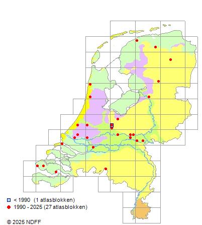 Het aantal atlasblokken (5x5 km) waarin de soort is gemeld binnen een periode van vijf jaar (vanaf 1980) of twintig jaar. Niet gecorrigeerd voor waarnemersinspanning en het aantal doorgegeven waarnemingen kan sterk variëren per periode, dus een trend in verspreiding kan hier niet direct uit worden afgelezen. Het opgegeven jaartal is het eerste jaar van de periode. Bron: gevalideerde waarnemingen uit de NDFF.