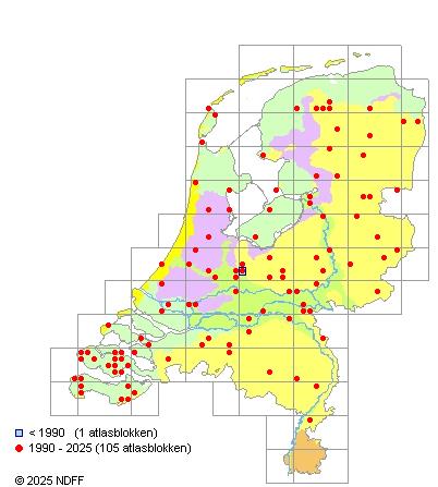 Het aantal atlasblokken (5x5 km) waarin de soort is gemeld binnen een periode van vijf jaar (vanaf 1980) of twintig jaar. Niet gecorrigeerd voor waarnemersinspanning en het aantal doorgegeven waarnemingen kan sterk variëren per periode, dus een trend in verspreiding kan hier niet direct uit worden afgelezen. Het opgegeven jaartal is het eerste jaar van de periode. Bron: gevalideerde waarnemingen uit de NDFF.