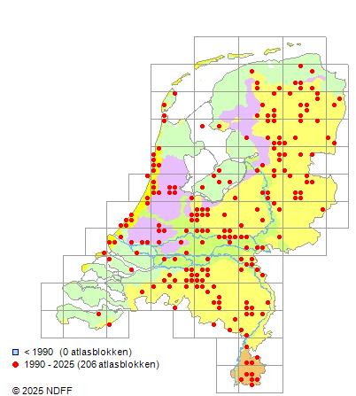 Het aantal atlasblokken (5x5 km) waarin de soort is gemeld binnen een periode van vijf jaar (vanaf 1980) of twintig jaar. Niet gecorrigeerd voor waarnemersinspanning en het aantal doorgegeven waarnemingen kan sterk variëren per periode, dus een trend in verspreiding kan hier niet direct uit worden afgelezen. Het opgegeven jaartal is het eerste jaar van de periode. Bron: gevalideerde waarnemingen uit de NDFF.