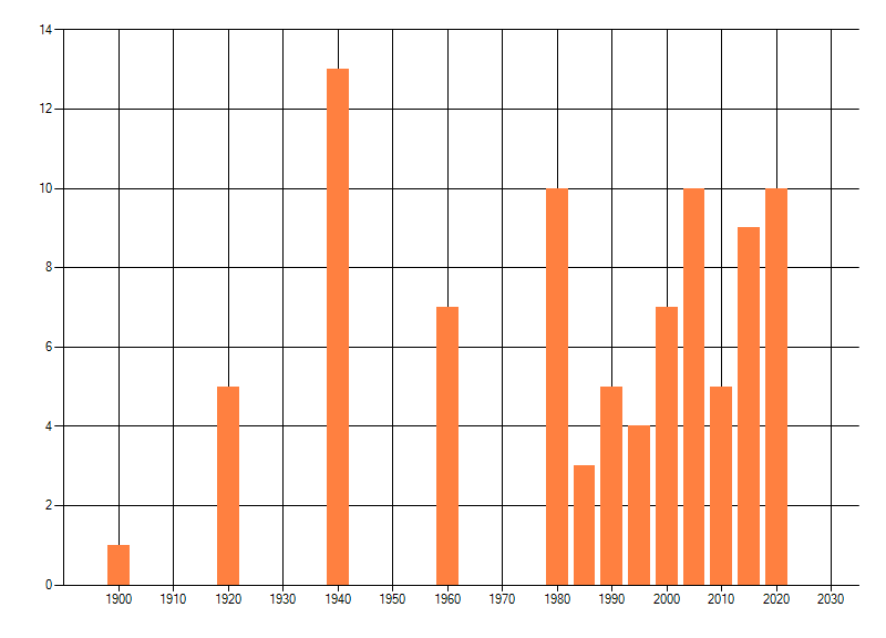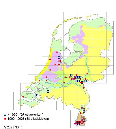 Het aantal atlasblokken (5x5 km) waarin de soort is gemeld binnen een periode van vijf jaar (vanaf 1980) of twintig jaar. Niet gecorrigeerd voor waarnemersinspanning en het aantal doorgegeven waarnemingen kan sterk variëren per periode, dus een trend in verspreiding kan hier niet direct uit worden afgelezen. Het opgegeven jaartal is het eerste jaar van de periode. Bron: gevalideerde waarnemingen uit de NDFF.