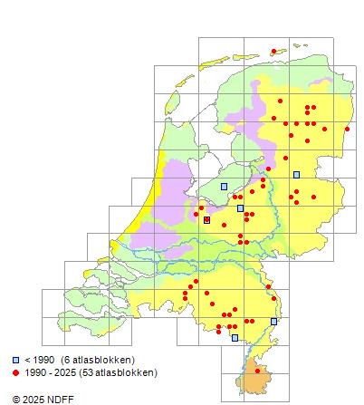 Het aantal atlasblokken (5x5 km) waarin de soort is gemeld binnen een periode van vijf jaar (vanaf 1980) of twintig jaar. Niet gecorrigeerd voor waarnemersinspanning en het aantal doorgegeven waarnemingen kan sterk variëren per periode, dus een trend in verspreiding kan hier niet direct uit worden afgelezen. Het opgegeven jaartal is het eerste jaar van de periode. Bron: gevalideerde waarnemingen uit de NDFF.