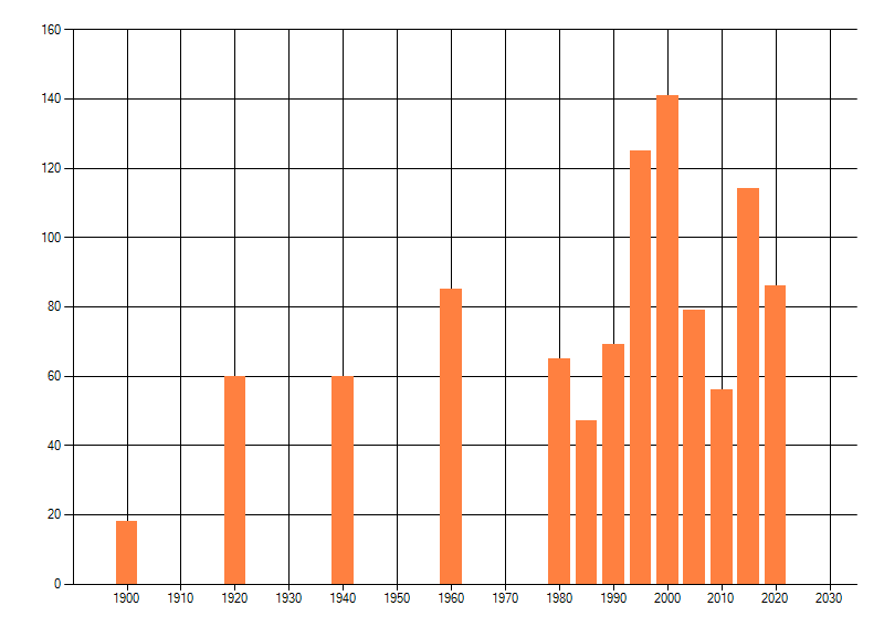 Het aantal atlasblokken (5x5 km) waarin de soort is gemeld binnen een periode van vijf jaar (vanaf 1980) of twintig jaar. Niet gecorrigeerd voor waarnemersinspanning en het aantal doorgegeven waarnemingen kan sterk variëren per periode, dus een trend in verspreiding kan hier niet direct uit worden afgelezen. Het opgegeven jaartal is het eerste jaar van de periode. Bron: gevalideerde waarnemingen uit de NDFF.