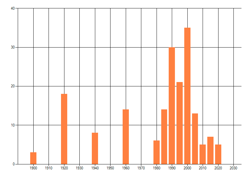Het aantal atlasblokken (5x5 km) waarin de soort is gemeld binnen een periode van vijf jaar (vanaf 1980) of twintig jaar. Niet gecorrigeerd voor waarnemersinspanning en het aantal doorgegeven waarnemingen kan sterk variëren per periode, dus een trend in verspreiding kan hier niet direct uit worden afgelezen. Het opgegeven jaartal is het eerste jaar van de periode. Bron: gevalideerde waarnemingen uit de NDFF.