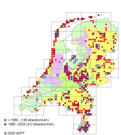 Het aantal atlasblokken (5x5 km) waarin de soort is gemeld binnen een periode van vijf jaar (vanaf 1980) of twintig jaar. Niet gecorrigeerd voor waarnemersinspanning en het aantal doorgegeven waarnemingen kan sterk variëren per periode, dus een trend in verspreiding kan hier niet direct uit worden afgelezen. Het opgegeven jaartal is het eerste jaar van de periode. Bron: gevalideerde waarnemingen uit de NDFF.