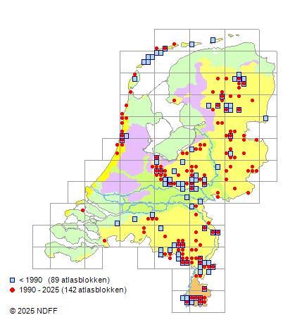 Het aantal atlasblokken (5x5 km) waarin de soort is gemeld binnen een periode van vijf jaar (vanaf 1980) of twintig jaar. Niet gecorrigeerd voor waarnemersinspanning en het aantal doorgegeven waarnemingen kan sterk variëren per periode, dus een trend in verspreiding kan hier niet direct uit worden afgelezen. Het opgegeven jaartal is het eerste jaar van de periode. Bron: gevalideerde waarnemingen uit de NDFF.