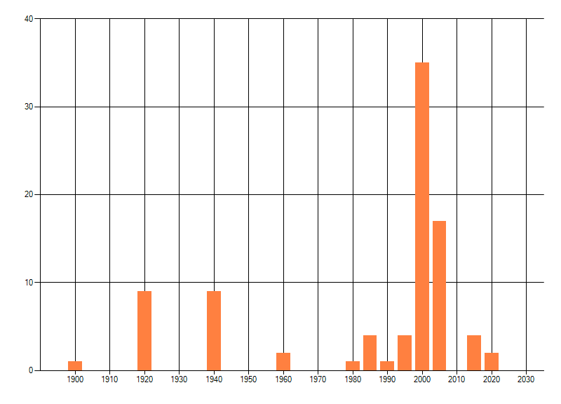 Het aantal atlasblokken (5x5 km) waarin de soort is gemeld binnen een periode van vijf jaar (vanaf 1980) of twintig jaar. Niet gecorrigeerd voor waarnemersinspanning en het aantal doorgegeven waarnemingen kan sterk variëren per periode, dus een trend in verspreiding kan hier niet direct uit worden afgelezen. Het opgegeven jaartal is het eerste jaar van de periode. Bron: gevalideerde waarnemingen uit de NDFF.