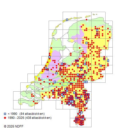 Het aantal atlasblokken (5x5 km) waarin de soort is gemeld binnen een periode van vijf jaar (vanaf 1980) of twintig jaar. Niet gecorrigeerd voor waarnemersinspanning en het aantal doorgegeven waarnemingen kan sterk variëren per periode, dus een trend in verspreiding kan hier niet direct uit worden afgelezen. Het opgegeven jaartal is het eerste jaar van de periode. Bron: gevalideerde waarnemingen uit de NDFF.