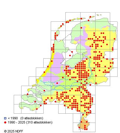 Het aantal atlasblokken (5x5 km) waarin de soort is gemeld binnen een periode van vijf jaar (vanaf 1980) of twintig jaar. Niet gecorrigeerd voor waarnemersinspanning en het aantal doorgegeven waarnemingen kan sterk variëren per periode, dus een trend in verspreiding kan hier niet direct uit worden afgelezen. Het opgegeven jaartal is het eerste jaar van de periode. Bron: gevalideerde waarnemingen uit de NDFF.