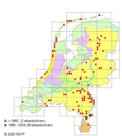 Het aantal atlasblokken (5x5 km) waarin de soort is gemeld binnen een periode van vijf jaar (vanaf 1980) of twintig jaar. Niet gecorrigeerd voor waarnemersinspanning en het aantal doorgegeven waarnemingen kan sterk variëren per periode, dus een trend in verspreiding kan hier niet direct uit worden afgelezen. Het opgegeven jaartal is het eerste jaar van de periode. Bron: gevalideerde waarnemingen uit de NDFF.