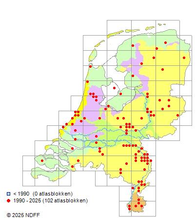Het aantal atlasblokken (5x5 km) waarin de soort is gemeld binnen een periode van vijf jaar (vanaf 1980) of twintig jaar. Niet gecorrigeerd voor waarnemersinspanning en het aantal doorgegeven waarnemingen kan sterk variëren per periode, dus een trend in verspreiding kan hier niet direct uit worden afgelezen. Het opgegeven jaartal is het eerste jaar van de periode. Bron: gevalideerde waarnemingen uit de NDFF.