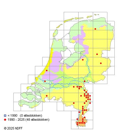 Het aantal atlasblokken (5x5 km) waarin de soort is gemeld binnen een periode van vijf jaar (vanaf 1980) of twintig jaar. Niet gecorrigeerd voor waarnemersinspanning en het aantal doorgegeven waarnemingen kan sterk variëren per periode, dus een trend in verspreiding kan hier niet direct uit worden afgelezen. Het opgegeven jaartal is het eerste jaar van de periode. Bron: gevalideerde waarnemingen uit de NDFF.