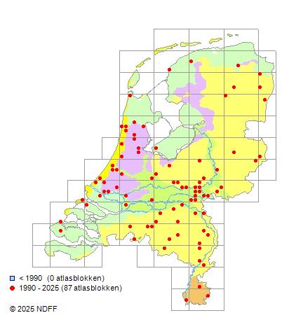 Het aantal atlasblokken (5x5 km) waarin de soort is gemeld binnen een periode van vijf jaar (vanaf 1980) of twintig jaar. Niet gecorrigeerd voor waarnemersinspanning en het aantal doorgegeven waarnemingen kan sterk variëren per periode, dus een trend in verspreiding kan hier niet direct uit worden afgelezen. Het opgegeven jaartal is het eerste jaar van de periode. Bron: gevalideerde waarnemingen uit de NDFF.