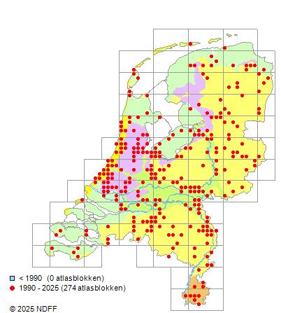 Het aantal atlasblokken (5x5 km) waarin de soort is gemeld binnen een periode van vijf jaar (vanaf 1980) of twintig jaar. Niet gecorrigeerd voor waarnemersinspanning en het aantal doorgegeven waarnemingen kan sterk variëren per periode, dus een trend in verspreiding kan hier niet direct uit worden afgelezen. Het opgegeven jaartal is het eerste jaar van de periode. Bron: gevalideerde waarnemingen uit de NDFF.
