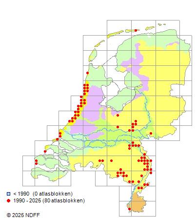 Het aantal atlasblokken (5x5 km) waarin de soort is gemeld binnen een periode van vijf jaar (vanaf 1980) of twintig jaar. Niet gecorrigeerd voor waarnemersinspanning en het aantal doorgegeven waarnemingen kan sterk variëren per periode, dus een trend in verspreiding kan hier niet direct uit worden afgelezen. Het opgegeven jaartal is het eerste jaar van de periode. Bron: gevalideerde waarnemingen uit de NDFF.