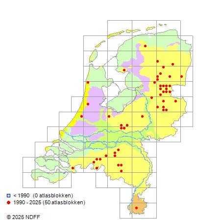 Het aantal atlasblokken (5x5 km) waarin de soort is gemeld binnen een periode van vijf jaar (vanaf 1980) of twintig jaar. Niet gecorrigeerd voor waarnemersinspanning en het aantal doorgegeven waarnemingen kan sterk variëren per periode, dus een trend in verspreiding kan hier niet direct uit worden afgelezen. Het opgegeven jaartal is het eerste jaar van de periode. Bron: gevalideerde waarnemingen uit de NDFF.