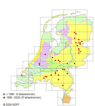 Het aantal atlasblokken (5x5 km) waarin de soort is gemeld binnen een periode van vijf jaar (vanaf 1980) of twintig jaar. Niet gecorrigeerd voor waarnemersinspanning en het aantal doorgegeven waarnemingen kan sterk variëren per periode, dus een trend in verspreiding kan hier niet direct uit worden afgelezen. Het opgegeven jaartal is het eerste jaar van de periode. Bron: gevalideerde waarnemingen uit de NDFF.
