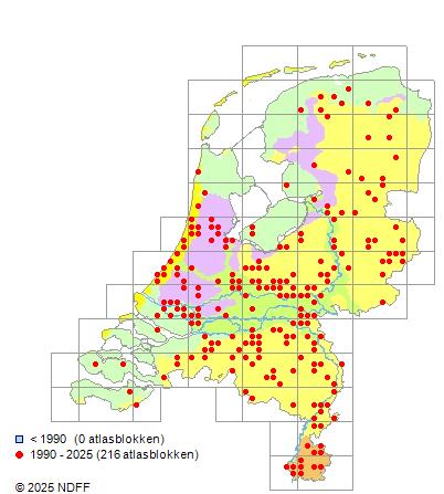 Het aantal atlasblokken (5x5 km) waarin de soort is gemeld binnen een periode van vijf jaar (vanaf 1980) of twintig jaar. Niet gecorrigeerd voor waarnemersinspanning en het aantal doorgegeven waarnemingen kan sterk variëren per periode, dus een trend in verspreiding kan hier niet direct uit worden afgelezen. Het opgegeven jaartal is het eerste jaar van de periode. Bron: gevalideerde waarnemingen uit de NDFF.
